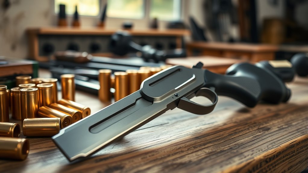 Since having the right accessories at your fingertips can streamline your reloading process, you should prioritize power case trimmers that come with essential tools like chamferers, deburrers, primer pocket scrapers, or pilots. Also, check if the trimmer offers built-in or separate storage to keep these tools organized and accessible.