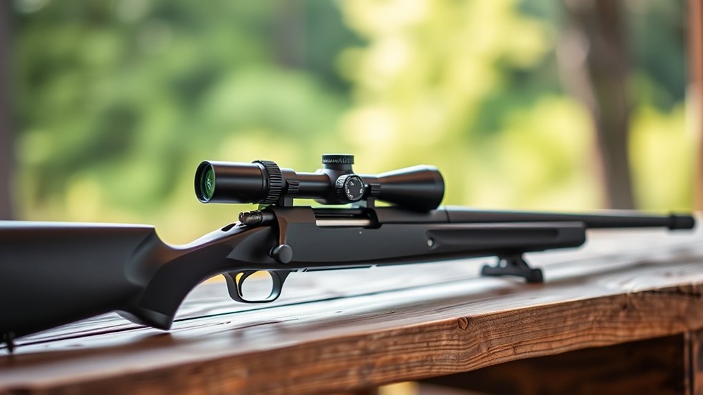 Since your precision rimfire scope’s lens directly affects what you see, investing in high-quality optics is essential. Lenses with multiple coatings boost light transmission, delivering brighter, clearer images that help you spot targets faster.