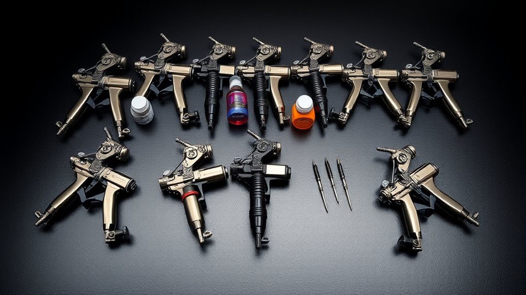 Choosing the right tattoo gun kit means guaranteeing it works seamlessly with a variety of needle types and configurations. You’ll want a kit compatible with standard cartridge needles to handle different styles effortlessly. Confirm your machine supports sterilized, disposable needle joints to prioritize hygiene and safety during sessions.