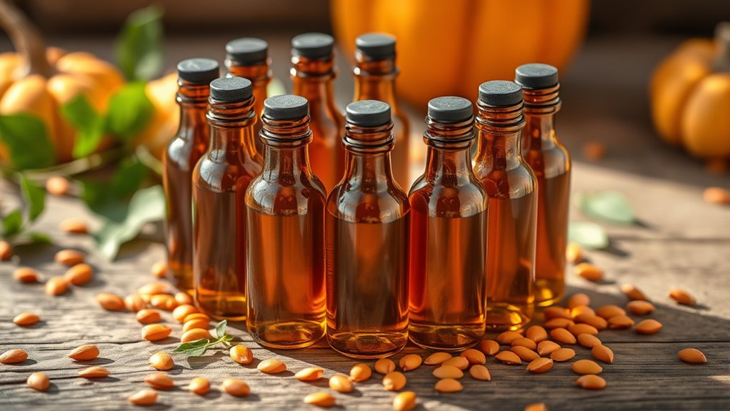 When selecting pumpkin seed oil for hair care, you’ll want to pay close attention to its packaging and storage requirements to preserve its quality. Choose oils packaged in dark glass bottles, as they protect the oil from light exposure that can degrade its potency and nutritional value.