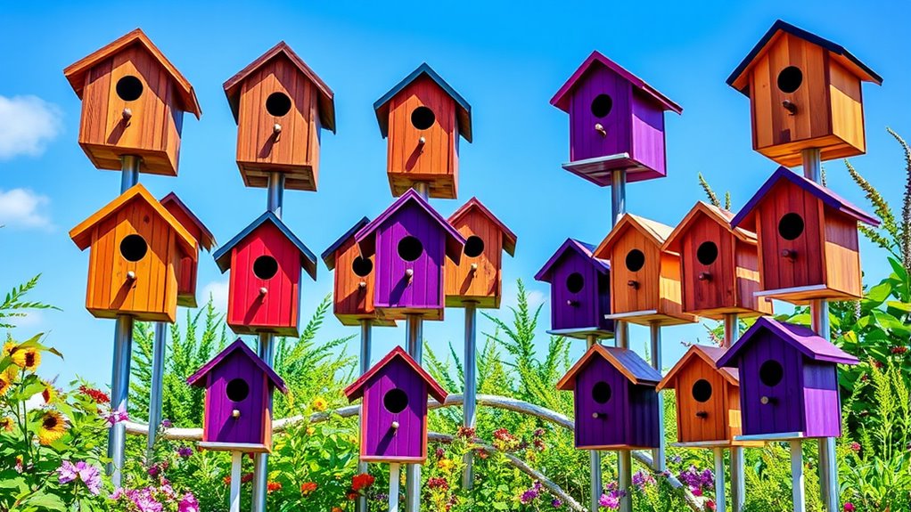 Plus, natural colors blend into your yard while reflective roofs keep the birds comfortable. Keep exploring to find the perfect setup for vibrant purple martin activity.