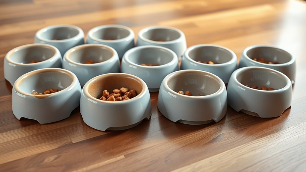 Choosing the right puzzle feeder bowls means matching them to both dry and wet foods your pet enjoys, so look for compatibility with different textures and moisture levels. You’ll want a bowl that supports a range of diets, from kibble to moist meals, ensuring it handles various textures without clogging or mess. Confirm the portion size fits your pet’s age and breed, typically 1 to 4 cups, so mealtime stays appropriate.
