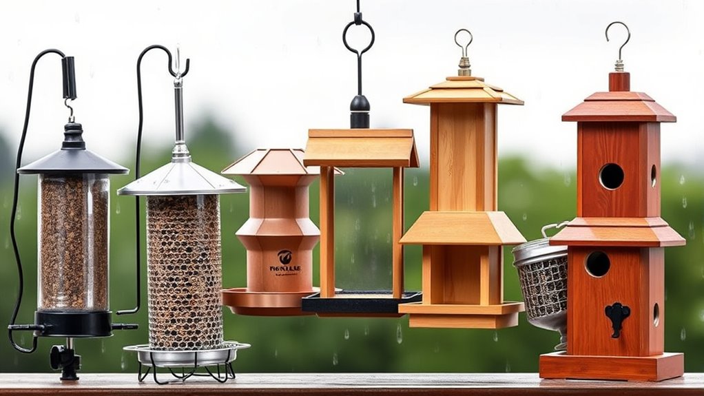 When you pick a rain-proof feeder, start with a weatherproof dome design that shields seeds while you can easily access the seed tray for drainage checks. Consider how the tray drains and how durable materials resist weather, squirrels, and wear.