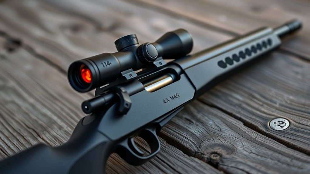 Because a .44 Magnum rifle delivers significant recoil, you’ll need a red dot sight built to handle that force without losing zero or sustaining damage. Look for models crafted from aircraft-grade aluminum or reinforced polymer, ensuring impact resistance and durability during rough handling.