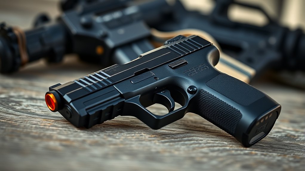 After ensuring your red dot sight mounts securely on your Beretta APX A1, you’ll want to focus on the reticle size and type to match your shooting style. Smaller reticles, like 2 MOA, offer pinpoint accuracy for precision shooting, while larger ones, such as 5 MOA, let you acquire targets faster.