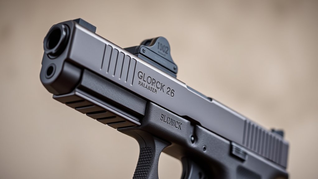 Choosing a red dot sight for your Glock 26 requires careful attention to compatibility, especially since the compact design demands precise fitting. Make sure the sight is designed for the Glock 26’s slide footprint, such as RMR or MOS cut types. Check if the sight includes adapter plates or mounting options tailored for Glock 26 to guarantee a secure fit.