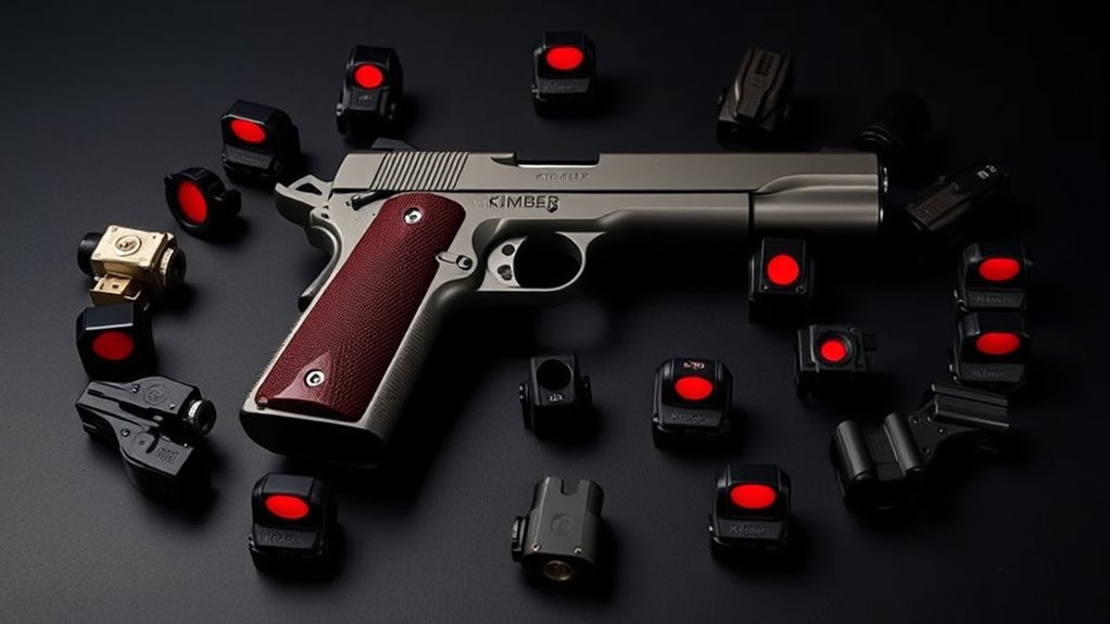 You’ll find top red dots for your Kimber 1911 that offer durable, shockproof designs and seamless compatibility with Novak and Picatinny mounts. These sights provide bright, adjustable reticles with excellent optical clarity and long battery life, featuring easy zeroing and power-saving tech like Shake Awake.