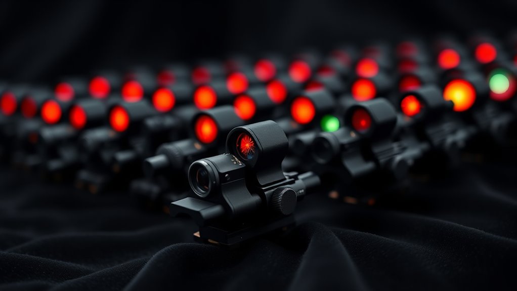 Multi-reticle systems let you switch patterns to suit the scenario, keeping you adaptable. Reticle brightness and visibility matter too, since lighting can swing accuracy; guarantee you have adjustable brightness. Reticle style also affects visibility: simpler dots aid fast shots, whereas complex reticles support precision aiming.