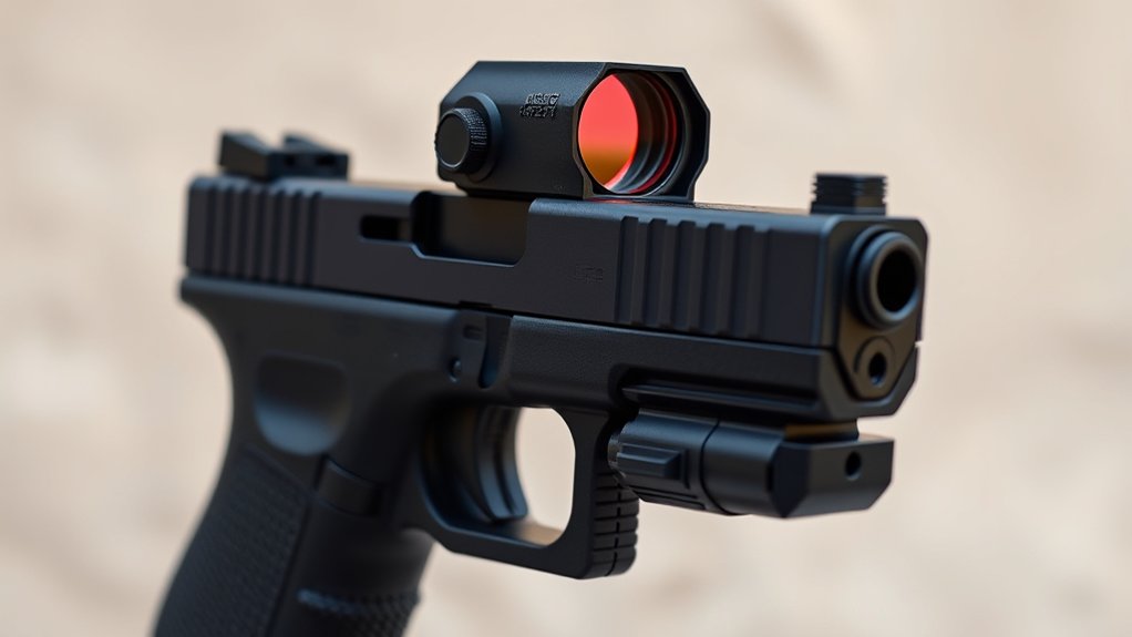 When selecting a red dot sight for your Glock 19, you’ll want to prioritize durability to guarantee it holds up under recoil and tough conditions. Choose sights made from aircraft-grade aluminum or titanium to endure rough handling.