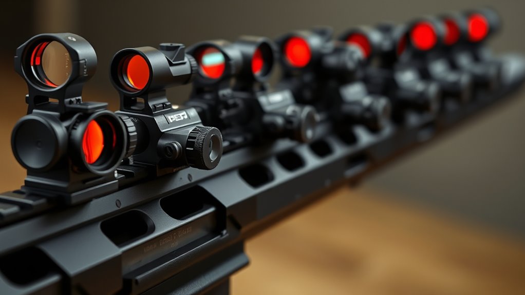 Look for models with parallax-free designs and coatings that reduce glare. You’ll find reputable options from brands like Aimpoint, C-More, Leupold, and EOTech, plus newer optics offering etched reticles as backups.