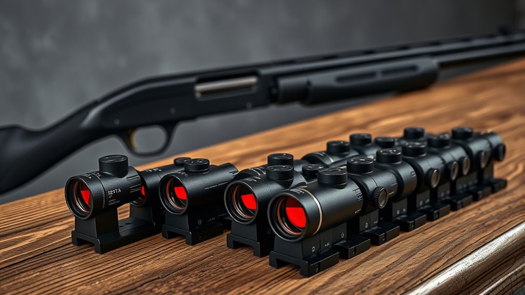 Mounting versatility is key, so choose a red dot sight with a secure mounting system like Picatinny or a Beretta-specific interface that truly fits the Beretta 1301. Guarantee the sight has a compatible mounting system for secure attachment and look for multiple mounting plates or adapters to cover different firearm models and configurations.