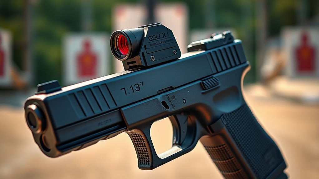 Also, consider the sight’s height; a lower profile helps co-witness with your iron sights, allowing a smooth shift between aiming methods. Ensuring the sight doesn’t protrude beyond the slide preserves your Glock’s sleek design and handling efficiency.