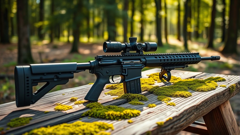 Weather resistance is just as crucial. Select sights with at least an IPX-4 rating to protect against water and fog. O-ring seals are a must to keep moisture out, preserving clarity and operational reliability in wet environments. Prioritize these durability and weather-resistant features to guarantee your red dot sight performs consistently, no matter the conditions you face in the field.