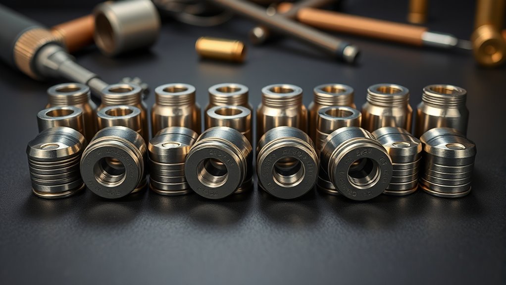Many die sets feature carbide construction, so you won’t need case lubrication during resizing—saving you time and hassle. Besides dies, quality kits often come with useful extras like load data sheets, shell holders, or rings, which can enhance your reloading precision. Understanding which dies and components come with your set helps you pick the best option for your specific reloading needs.