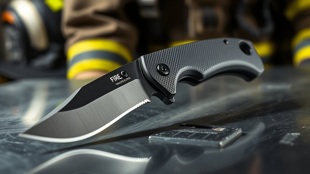 You need rescue knives with safety features like a secure locking mechanism to prevent accidental closure during use. A textured, non-slip handle guarantees a firm grip, even with gloves on. Look for blades with a quick-release system for easy deployment, and a built-in seatbelt cutter or glass breaker for emergency situations.