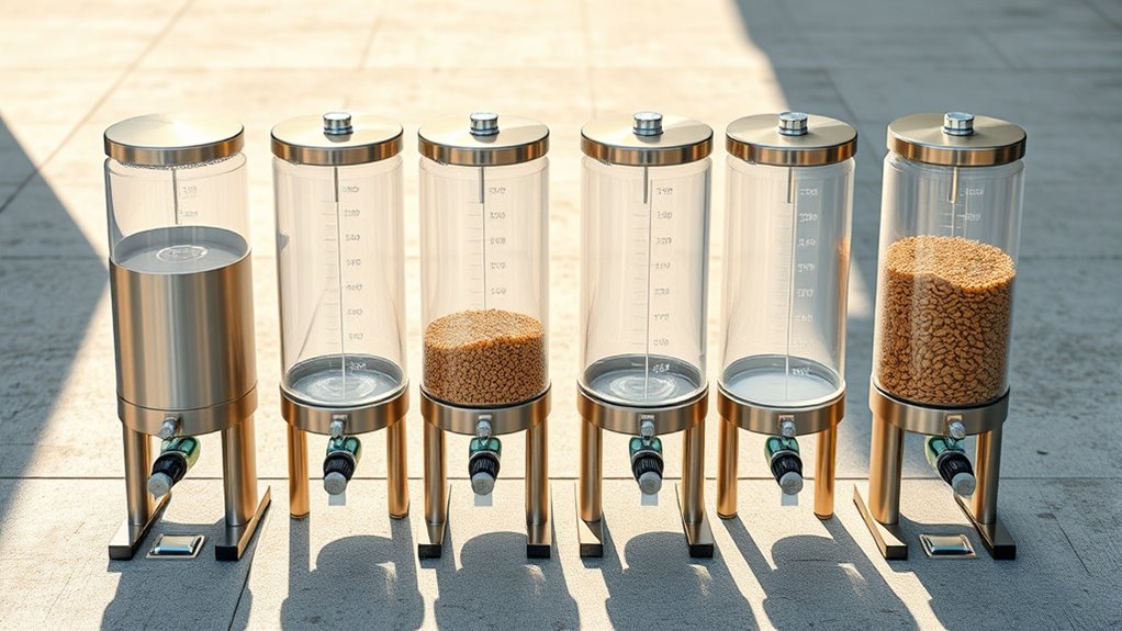 Weather resistance is the backbone of a reliable rice bran feeder, especially for outdoor use. You’ll want a unit built from durable materials like galvanized steel or sturdy synthetic plastics to withstand rain, snow, and humidity. Sealed lids and waterproof seals are essential to keep moisture out of the feed compartment, preserving dryness and preventing spoilage.