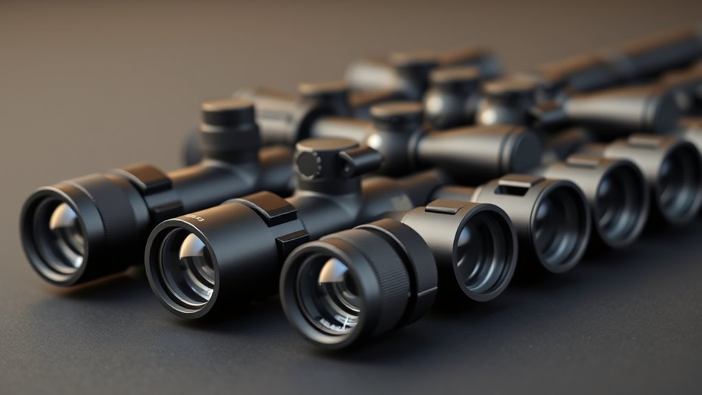 A shockproof design ensures your scope maintains zero and functionality even after rough handling. Check for durability specs, such as resistance to over 1000 rounds or impact tests, confirming the scope’s ability to endure extensive use. Prioritizing these factors means your scope will stay dependable and accurate no matter the environment or shooting demands.