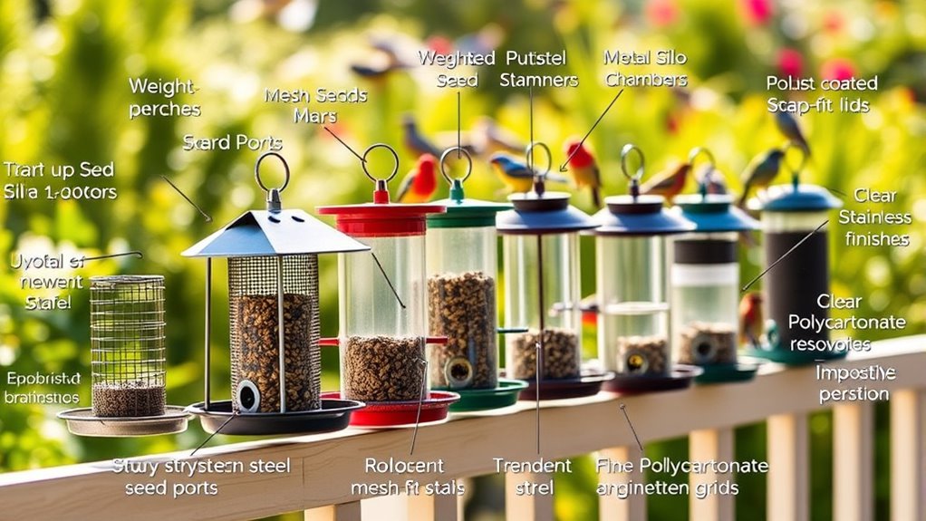 Built with powder-coated metal, chew-proof components, and weatherproof roofs, these feeders resist rust and damage. Easy assembly, refills, and cleaning help you enjoy mess-free feeding—more details await.