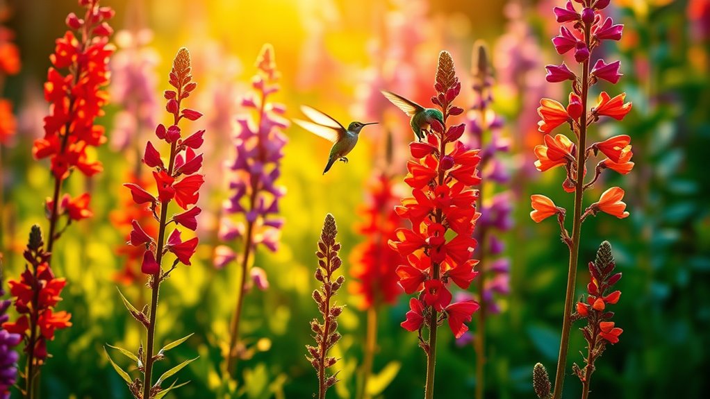 Tubular-shaped flowers are essential since they fit hummingbirds’ long beaks perfectly, making feeding easier and more efficient. You should also consider how long the flowers bloom continuously—plants that offer nectar over an extended season keep hummingbirds coming back. Finally, a healthy salvia that produces ample nectar will attract more pollinators, so maintaining your plants well is vital.
