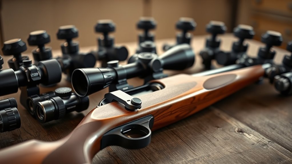 When mounting a scope on your .44 Mag rifle, you’ll want to guarantee the system matches your rifle’s rail type, whether it’s Picatinny or Weaver. Next, confirm the scope’s tube diameter aligns with the mounting rings or bases you plan to use. Check if the scope includes adjustable or quick-detach mounts for a stable, secure fit.