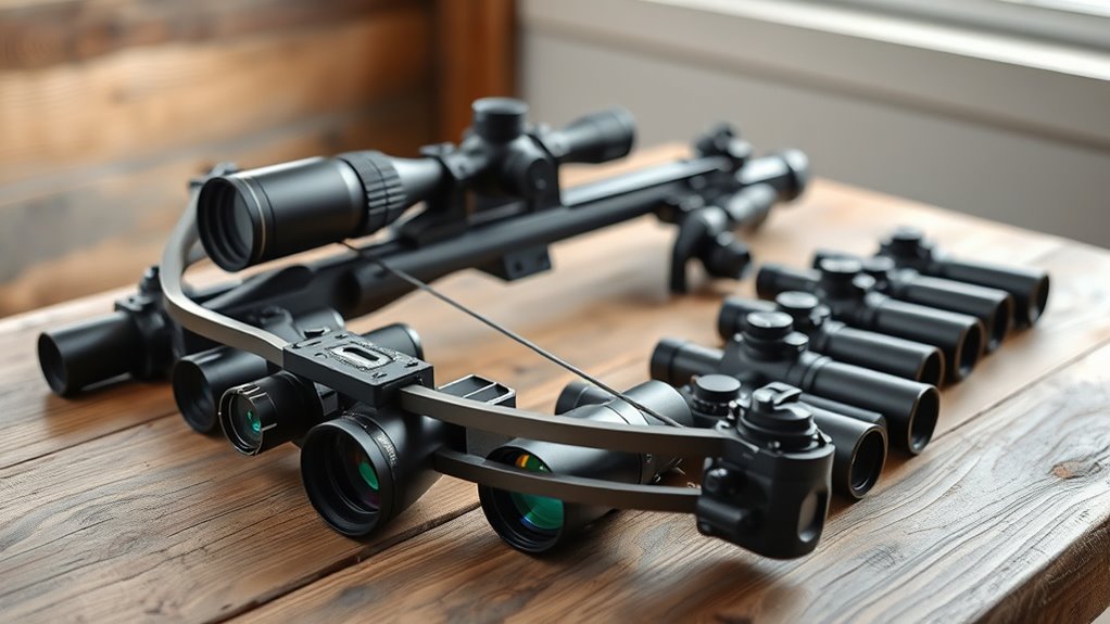 Keep in mind, higher magnification sharpens clarity but narrows your field of view, which may slow target acquisition. Some scopes offer variable magnification, letting you adjust based on conditions and preference. Always opt for scopes with high-quality lens materials to guarantee clear visibility and durability, especially when hunting in low-light or challenging environments.