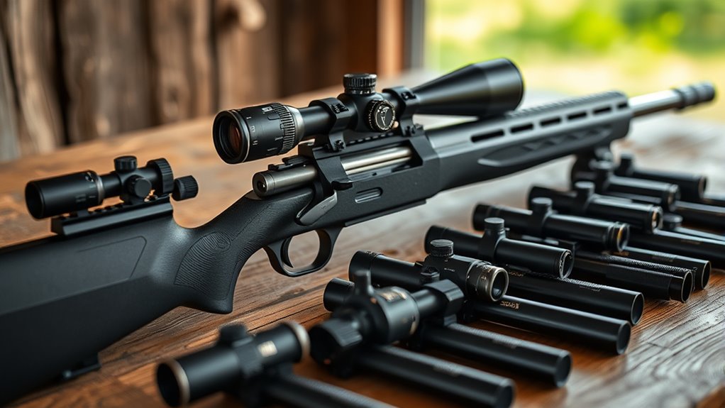 These scopes balance weather resistance, smooth adjustments, and clear reticles to keep you confident on any shoot. Keep exploring to discover how each performs in detail.