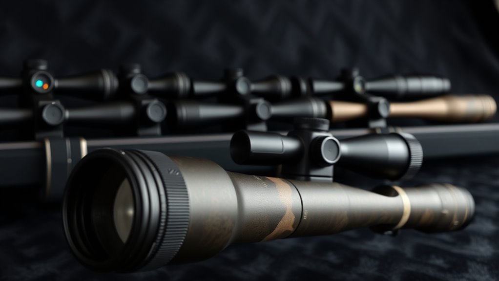 Reticle choice matters too: mil-dot or BDC helps estimate range and holdover, boosting accuracy when you’re dialing in at distance. Illuminated reticles enhance visibility in low light, so dawn and dusk shooting stays consistent. The MOA versus mil-dot decision affects how you compute adjustments; mil-dot reticles are often favored for longer-range precision.