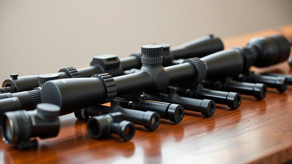 For a perfect fit, consider your target distance and environment—if you keep these factors in mind, you’ll find the ideal scope. Keep exploring to discover more options.