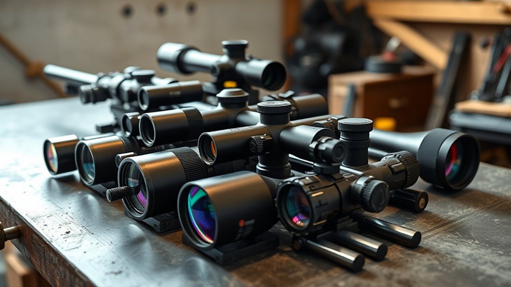 Glass clarity and light transmission directly shapes the sharpness you’ll see at any magnification, so choose optics with top-tier glass and minimal chromatic aberration. Your best scopes use fully multi-coated lenses to boost light transmission, yielding brighter images in dawn or dusk.
