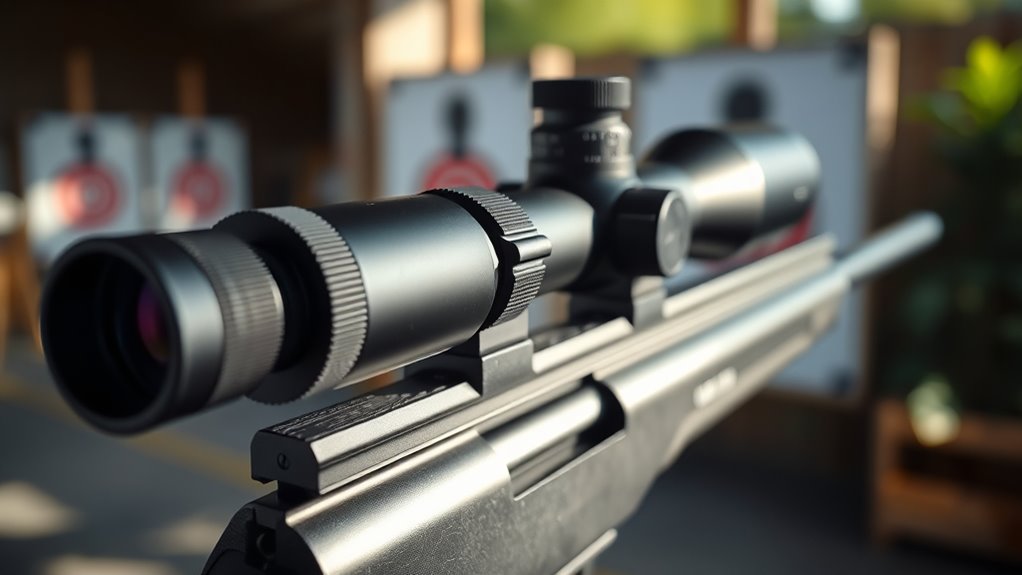 Magnification levels play a crucial role in how well you can aim and identify targets through your air pistol scope. They determine how much larger the target appears, impacting your accuracy and target recognition. Most air pistol scopes feature low magnifications, like 1x to 4x, ideal for close to mid-range shooting.