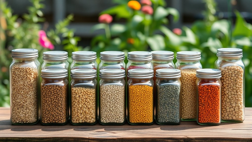 Choosing seed storage containers with durable materials is essential for guaranteeing your seeds stay viable over time. Metal and high-quality plastics are excellent options because they resist rust and wear, providing long-lasting protection.