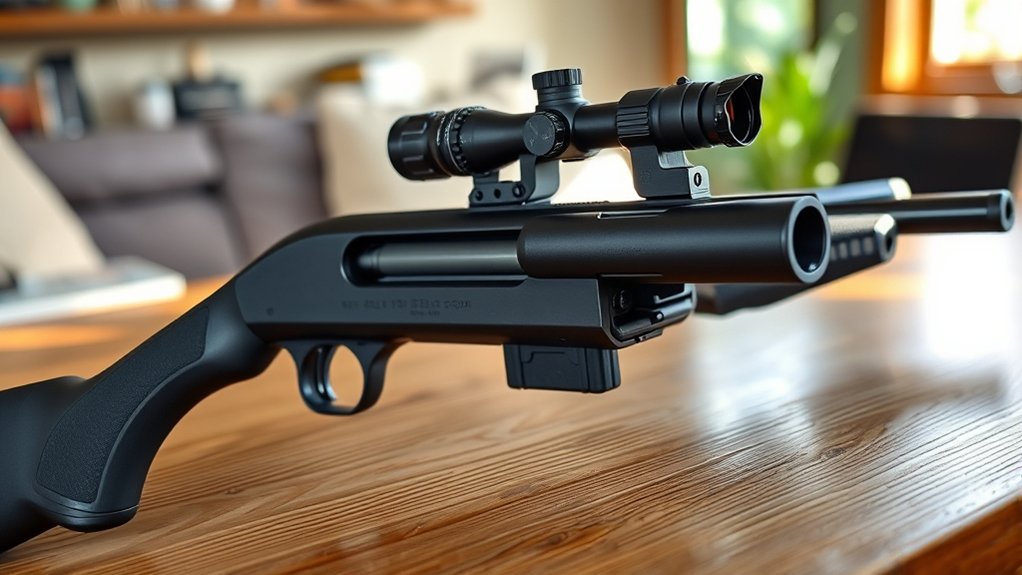 When choosing shotgun optics for home defense, you’ll want to focus on the reticle type and how easily you can adjust it. Different reticles like dots, circles, or crosshairs offer unique advantages for quick target acquisition, so pick one that suits your shooting style and environment.
