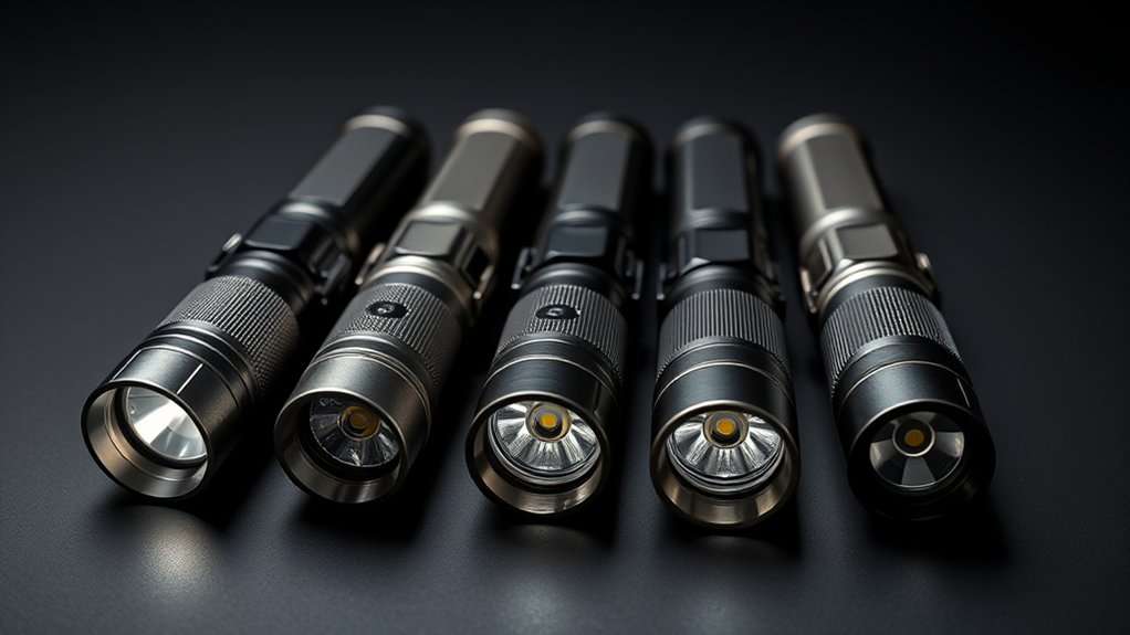 When selecting a shotgun weapon light, you’ll want one built from high-grade materials like anodized aluminum or impact-resistant polymers. This guarantees it stands up to heavy use. Look for models with reinforced construction and impact resistance to handle recoil, drops, and rough handling.