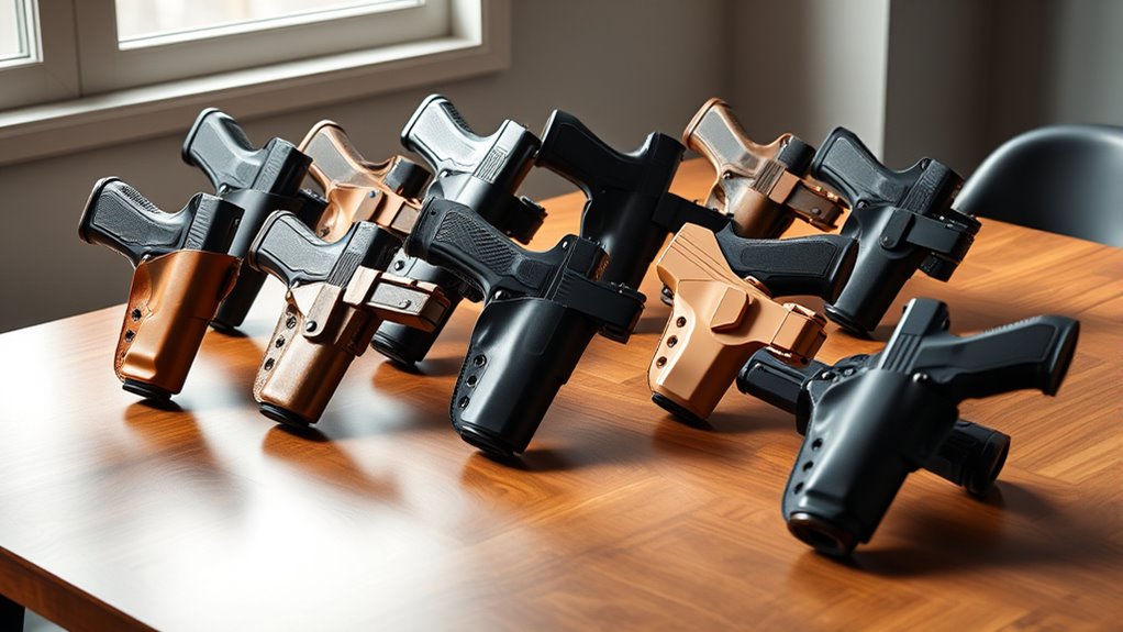 Some holsters even allow adjustments between carry positions, giving you the flexibility to switch based on your needs. Keep comfort in mind, too—certain orientations can cause strain during extended wear. By considering how easily you can access your firearm and how well it hides, you’ll choose a holster that balances practicality with comfort, ensuring you’re ready whenever the situation calls for it.