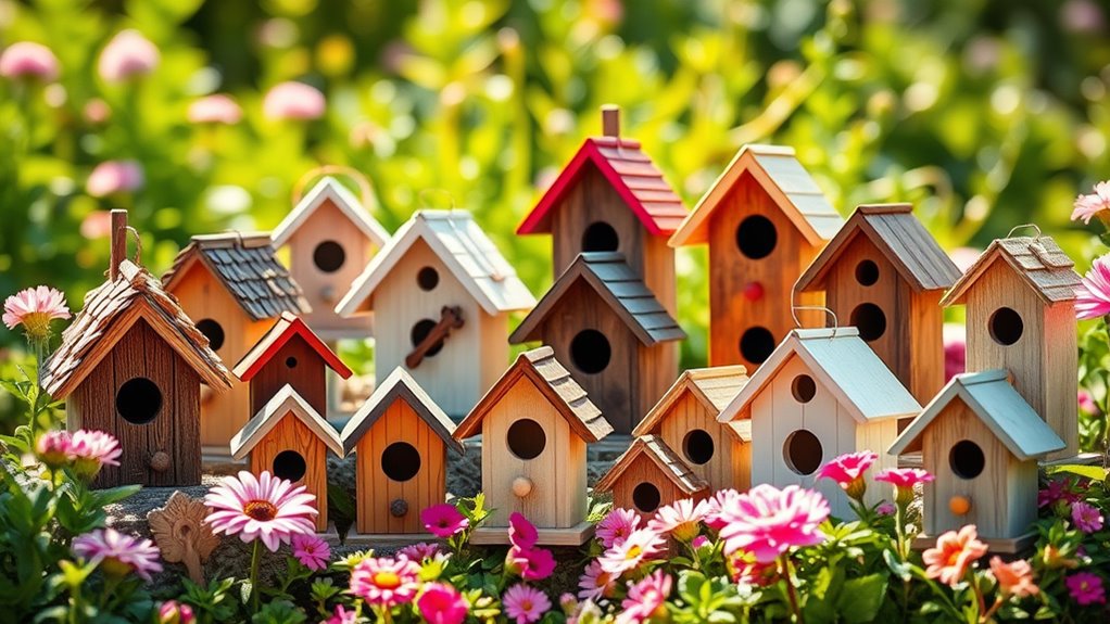 You’ll want small bird houses made from durable materials like cedar or pine, with proper ventilation, drainage, and predator guards to keep tiny songbirds safe and comfortable. Look for houses with entrance holes sized for wrens, chickadees, or hummingbirds, plus easy-to-clean designs featuring removable panels.