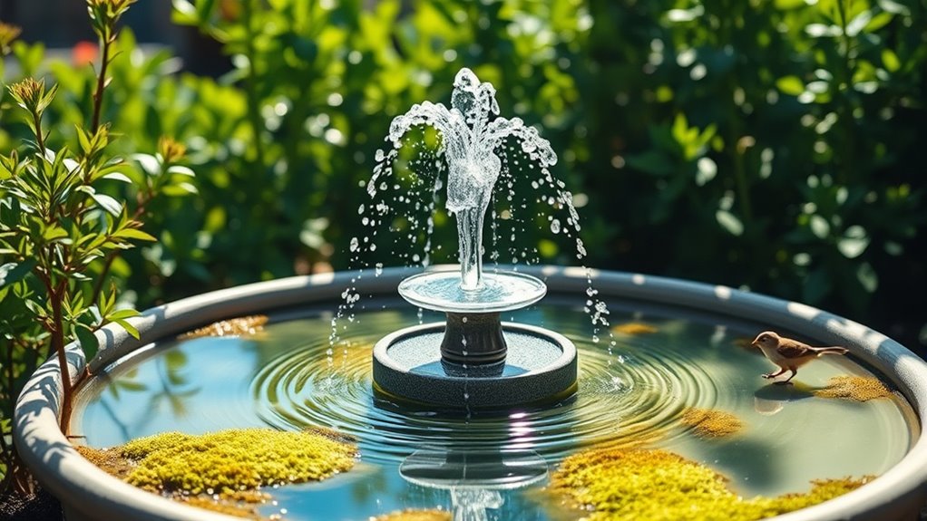 Look for adjustable nozzles and spray patterns you can tailor to your bath’s size, giving you a visually pleasing and functionally balanced setup. This approach keeps your bird bath calm, efficient, and attractive.