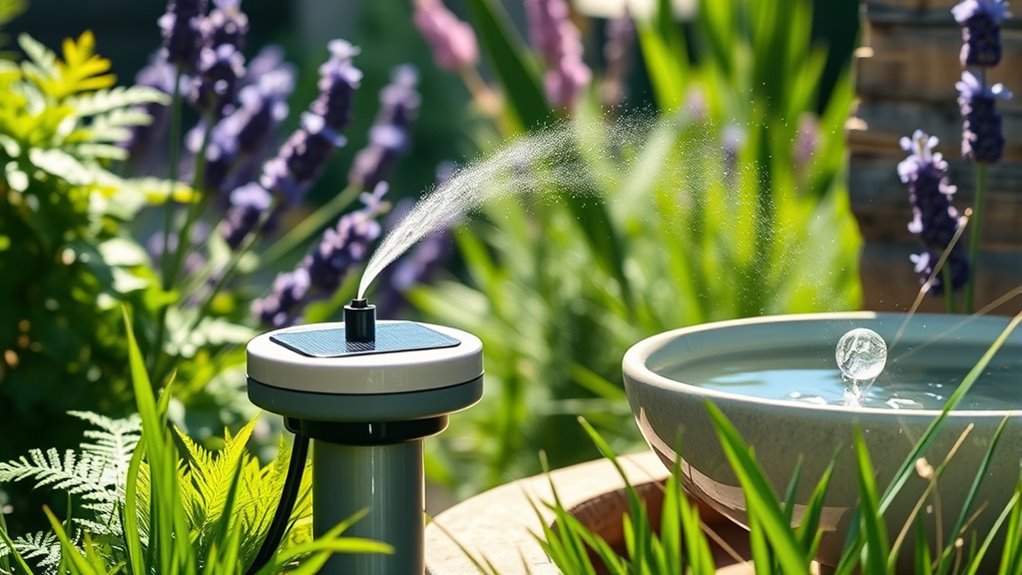 Durability and materials are key to a solar bird bath pump that lasts outdoors. You’ll want models built from high-quality plastics or corrosion-resistant metals to withstand sun, rain, and temperature swings. Look for ABS plastic and UV-resistant components that resist fading and cracking over time.