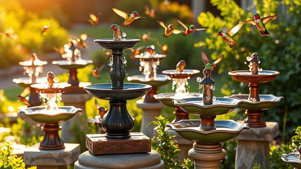 Though selecting a solar hummingbird bath fountain involves many factors, water spray patterns play a crucial role in attracting and accommodating birds. You’ll find different nozzles and adjustable settings that create various sprays, from gentle jets to fine mists. The height and shape of these sprays influence how appealing the fountain is to hummingbirds and other wildlife.