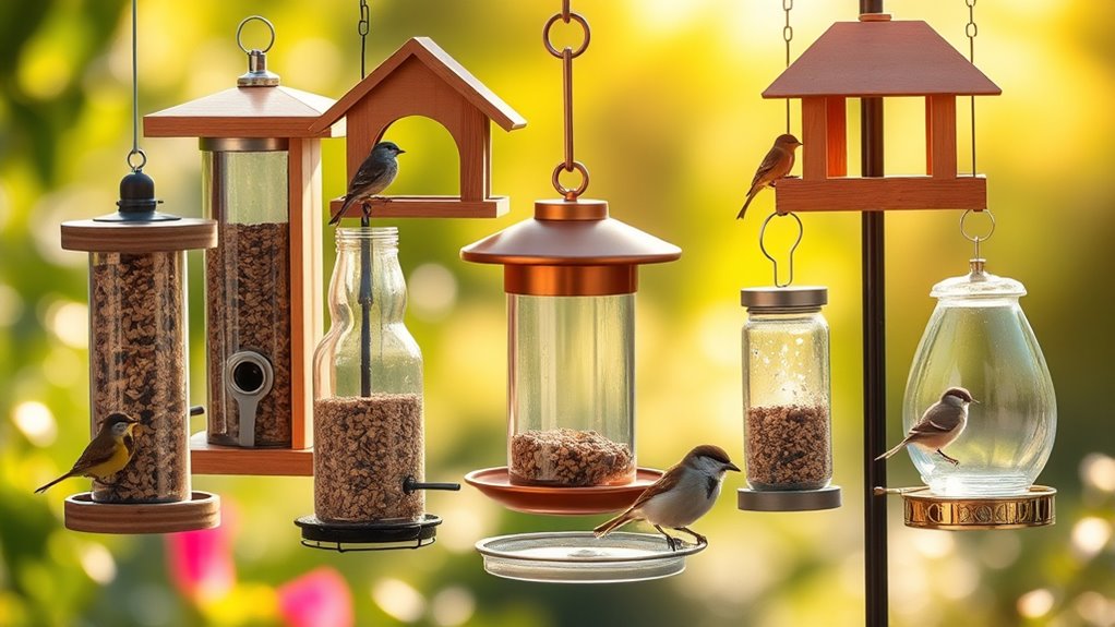 You want feeders that minimize waste, so choose weighted finch feeders, capped ports, and matte-surface trays that keep seeds put. Avoid loose-scoop designs and mesh tubes that spill everywhere. Opt for baffle-covered domes and weight-activated perches to deter squirrels.