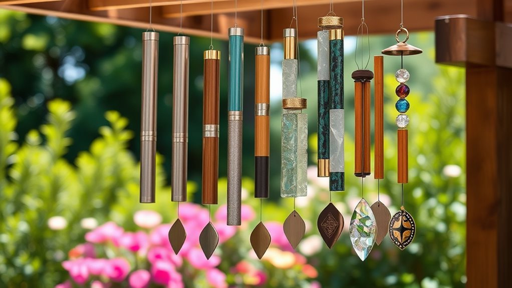 If you want crisp, lingering notes that carry in the breeze, choose metal chimes like aluminum or titanium—they’ll keep sounding great for years.