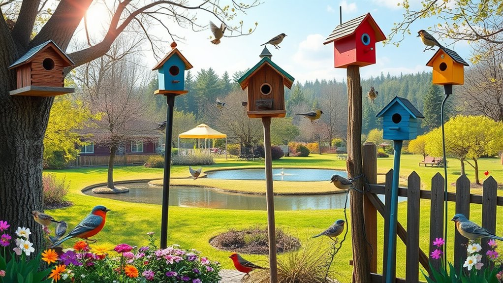 To keep your feathered friends safe, you’ll want to place birdhouses at least five feet off the ground and consider installing predator guards around the entrance. This height deters ground-based threats like snakes and raccoons, while metal guards stop larger animals from reaching inside.