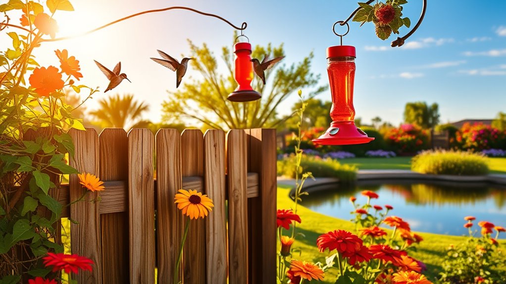 Balancing sunlight and shade helps keep your feeder inviting, but safety from predators is just as important to guarantee hummingbirds feel secure. Place your feeder away from dense shrubs or tall trees where cats and larger birds might lurk. Position it at least 5 to 6 feet high to keep ground predators at bay and give hummingbirds a clear flight path.