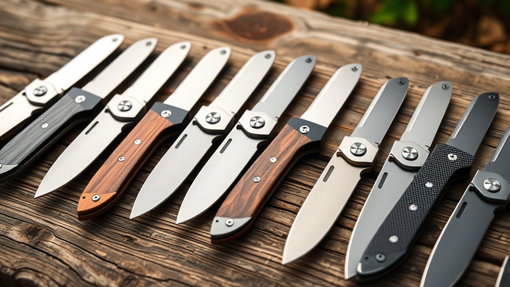 You’ll want a reliable mechanism, as it impacts your knife’s durability and safety during frequent use. Many designs include safety features like lockbacks or liner locks to prevent accidental closure once the blade’s open, ensuring peace of mind whenever you handle your knife.