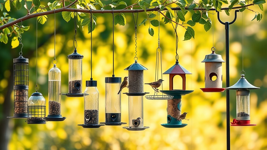 Expect weather-resistant plastics and metals, UV stabilization, and secure locking tops for durability. You’ll also see varied placements—hanging, poles, or stands—to fit your space. Keep going to uncover more details you’ll love.