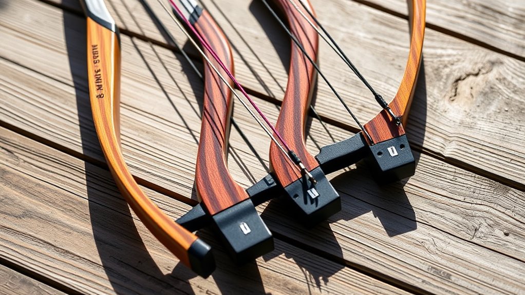Safety features are vital considerations when selecting a starter recurve bow, as they help prevent injuries and guarantee a smooth shooting experience. Armguards and finger tabs protect your skin from string slap and accidental cuts. Look for bows with durable construction and secure limb attachments to reduce the risk of breakage or accidents.