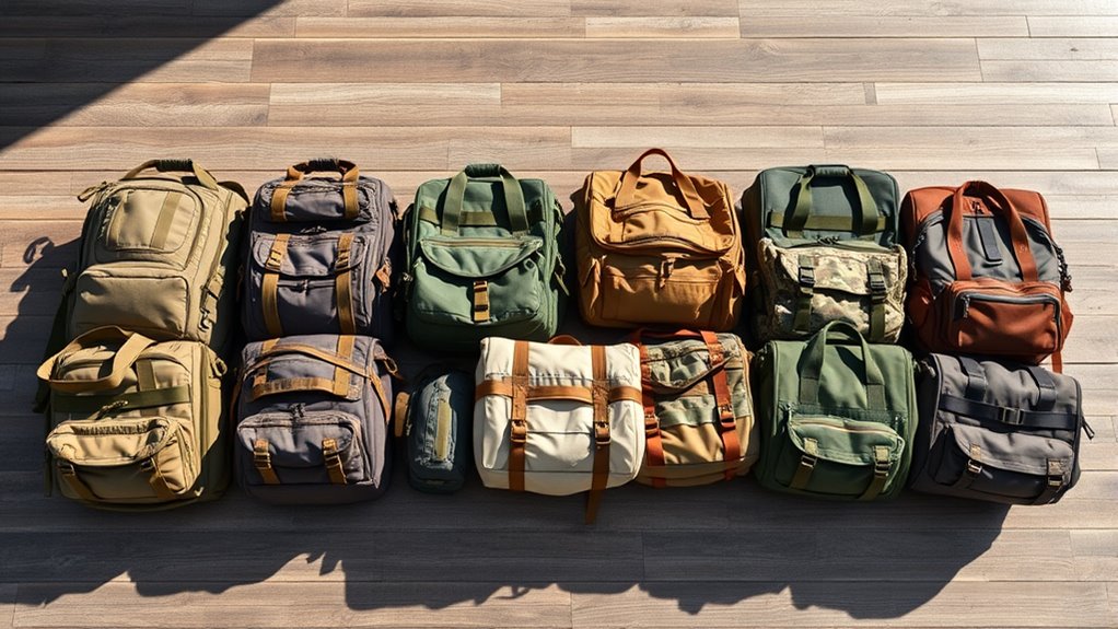 Reinforced stitching and waterproof coatings boost longevity, so check those details too. These materials guarantee your bag stands up to tough conditions and heavy use.