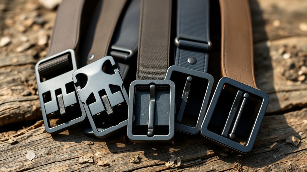 Opt for quick-release buckles or simple fastening systems that are straightforward to operate and maintain. Avoid belts that require sewing or complex adjustments, so you can trim or resize them easily as needed. Also, consider water and sweat-resistant features to keep your belt in good shape during rigorous activities and outdoor use.