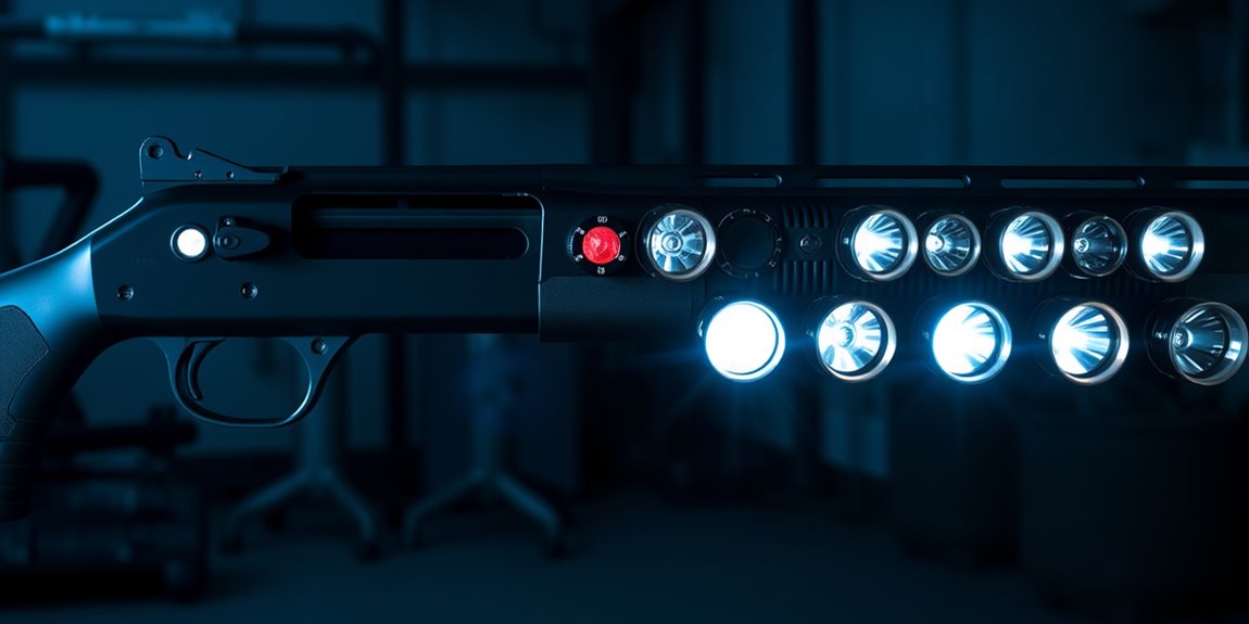 When choosing a tactical light for your Maverick 88, pay attention to the additional modes it offers, such as strobe, SOS, and multiple brightness levels, because they expand how you can respond to different situations. These modes boost tactical versatility and situational adaptability, letting you signal, disorient, or conserve battery life as needed.