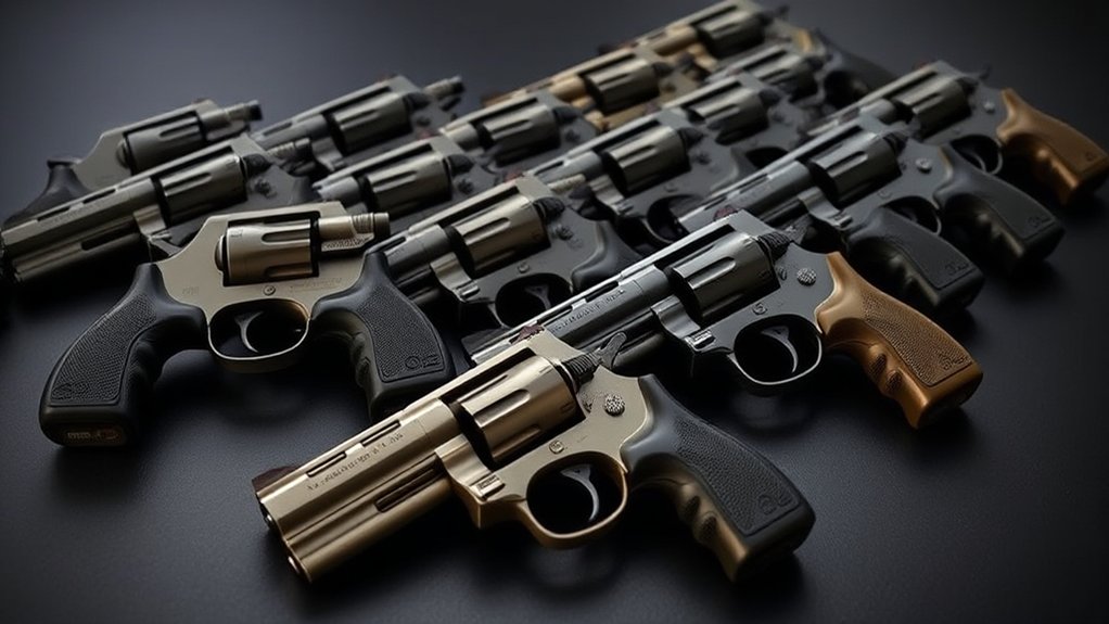 Choosing a tactical revolver means paying close attention to the materials used in its construction, as these directly impact durability and performance. You’ll want a revolver with a full-metal body or high-grade polymer to guarantee resilience. Metal components typically offer greater robustness than plastic or composite alternatives.