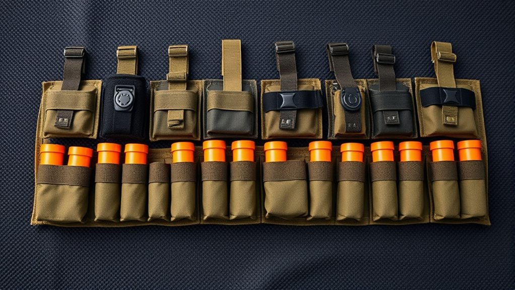Elastic loops and hook-and-loop closures hold shells securely, even when mud or moisture tries to interfere. Make sure the pouch is tested for harsh environments like heavy rain or sleet to guarantee reliability. Maintaining the pouch’s weather resistance is vital—you want your equipment to perform flawlessly during unpredictable outdoor missions or training sessions.